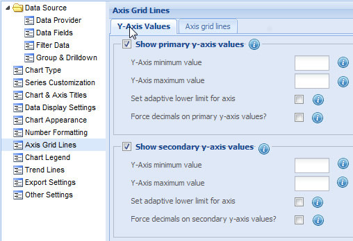 Setting minimum and maximum values for secondary Y-Axis You can specify the minimum and maximum values for the secondary Y-axis. By default, the minimum value for the secondary Y-Axis is zero and the maximum value is automatically calculated by the chart, based on the data provided.