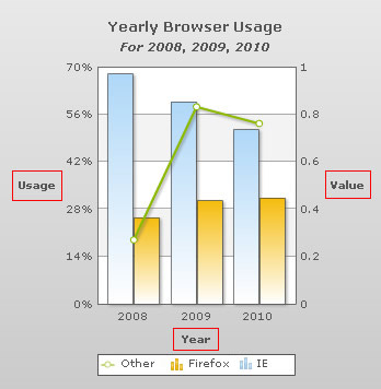 Collabion Charts for SharePoint allows you to add a heading and sub-heading to the specified chart. The heading and sub-heading provide a basic overview of information present in the chart. You can also set titles for the X-Axis and Y-Axis.