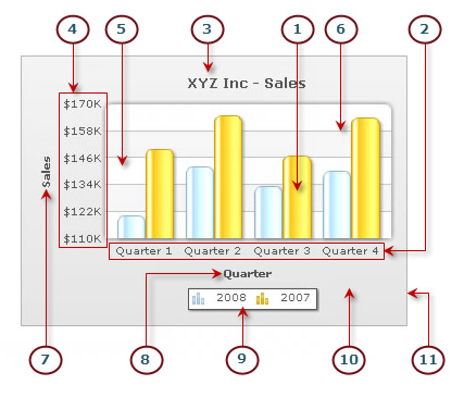 Understanding the common visual elements of a chart A chart is composed of various visual elements. The chart below shows the common visual elements.