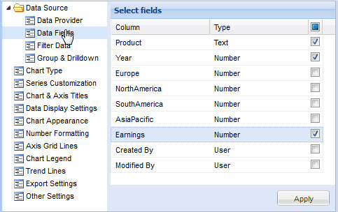 After connecting to the data provider you can opt to select data fields from which the chart will fetch data. The data field section is displayed as shown below: