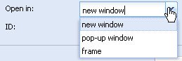 - Open in: You can specify the target window of the external link, that is, whether the Web Page will open in a new page, a pop-up window or in a frameset.