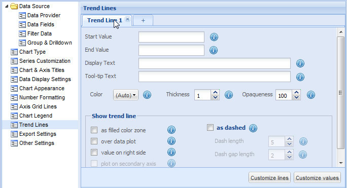 Note: To display the trend lines as continuous lines, clear the as dashed check box. On clearing this check box, all the related fields are deactivated. To configure the length of each dash and to set the space between each dash you need to: