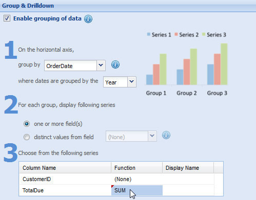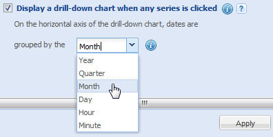 - Select Year in the drop down list under On the horizontal axis of the drill-down chart, group data by.