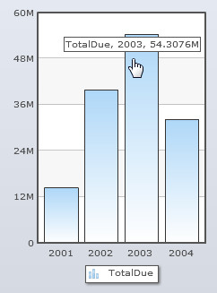 Now, a drill-down chart can be created which appears when a column is clicked on the summarized chart. The drill-down chart displays the breakdown of total amount sold per year. So, all the three years appears as the x-axis labels of the drill-down chart.