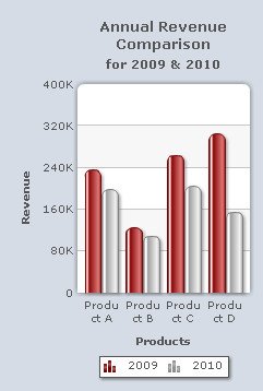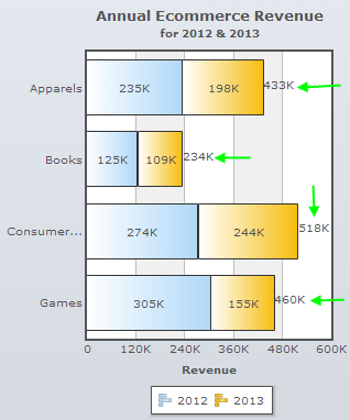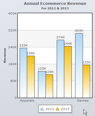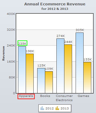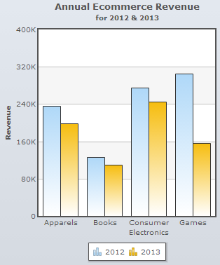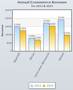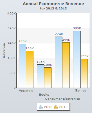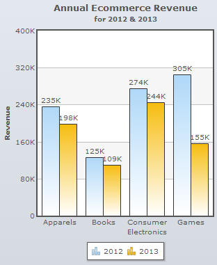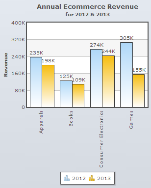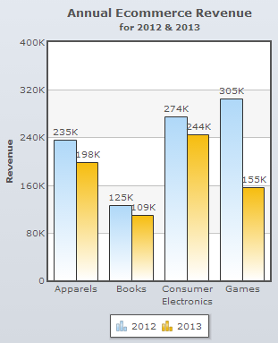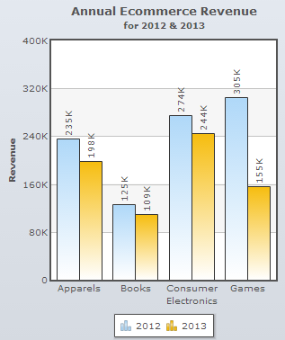 Note: To display the data values inside the dataplots (columns and bars), select the Place values inside data plot checkbox and click Preview to view the change. This setting is applicable only for column and bar charts. A chart displaying the data values inside the dataplots is shown below: Note: To display the total sum of each dataplot, select the Show summation values check box and click Preview to view the change.