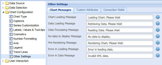 You can modify the various messages that are displayed on the chart, for example: ‘Error in loading data’, ‘Loading chart’, etc.