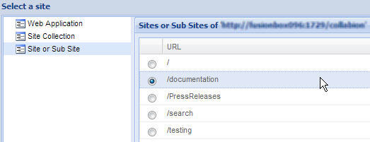 - Select Site or Sub Site under the previously chosen Site Collection. Click Finish.