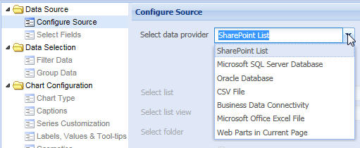 Collabion Charts for SharePoint allows you to create charts using data from various types of data providers. You can choose one of the following data providers: