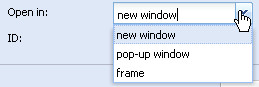 - Open in: You can specify the target window of the external link, that is, whether the web page will open in a new page, a pop-up window or in a frameset.