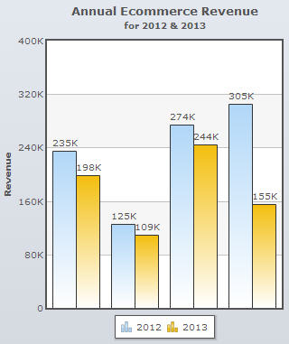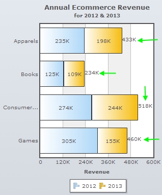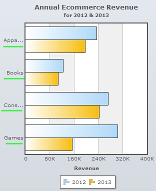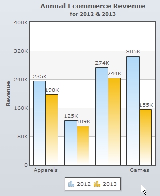 Note: To display the data values inside the dataplots (columns and bars), select the Place values inside data plot checkbox and click Preview to view the change. This setting is applicable only for column and bar charts. A chart displaying the data values inside the dataplots is shown below: Note: To display the total sum of each dataplot, select the Show summation values check box and click Preview to view the change.