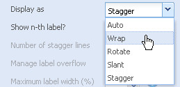 On selecting the Stagger mode, the Number of stagger lines box becomes active. This setting determines the number of steps that the labels will be displayed in. To display every n-th data label instead of all the data labels, select or enter a value in the Show n-th label? box and click Preview to view the change. The chart only displays the n-th label after the first data label, where n is the value provided. The first data label is always displayed. Note: This setting is not applicable for Pie or Doughnut charts.