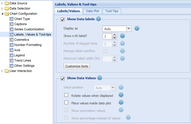 Labels refer to the names of the dataplots (columns, line/area/scatter/bubble) which appear below the X-Axis. They help in identifying individual data plots on the X-Axis. Data values refer to the values of the dataplots (columns, line/area/scatter/bubble, pie or doughnut slices).