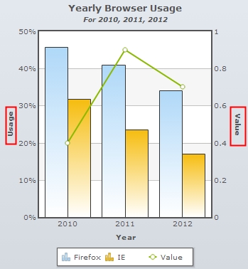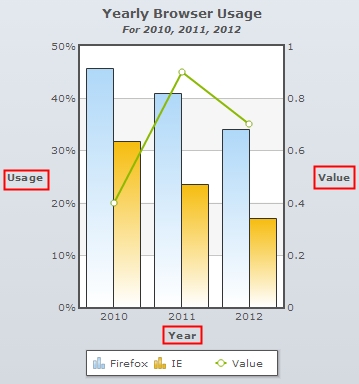 Note: You can add styles and effects to the axes titles. Click the Customize button beside the respective text boxes. The Customize Styles dialog box window that will open, allows you to define styles. Click here to learn how to use it. You can also configure dynamic text for Chart Title, Sub Title, X Axis Title and Y Axis Title through the following macros: