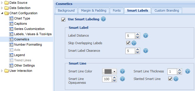 Note: Force to display all the labels When the smart labels setting is enabled, the chart skips and does not display some of the data labels to prevent overlapping. This scenario occurs when there are too many long data labels present. This setting is available only in Pie and Doughnut charts.